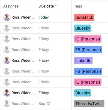 4) Set up the execution plan: I pulled my new strategy into a project management tool to lay out what to talk about where and how often, resulting in a monthly schedule I can continue to tweak and refine as I use it.